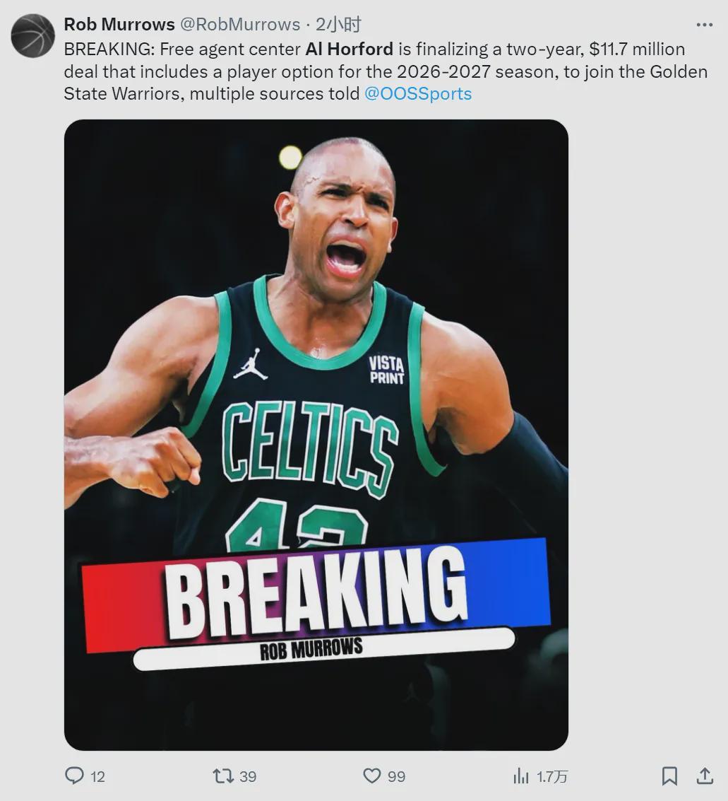 北京时间9月6日凌晨,据NBA记者Rob Murrows报道,勇士2年1170万美元签约霍福德,第二年球员选项。他出生于1986年6月3日,身高2米06,2007年探花秀,跟杜兰特同届。霍福德原有合同2年2000万美元,今年夏天到期。